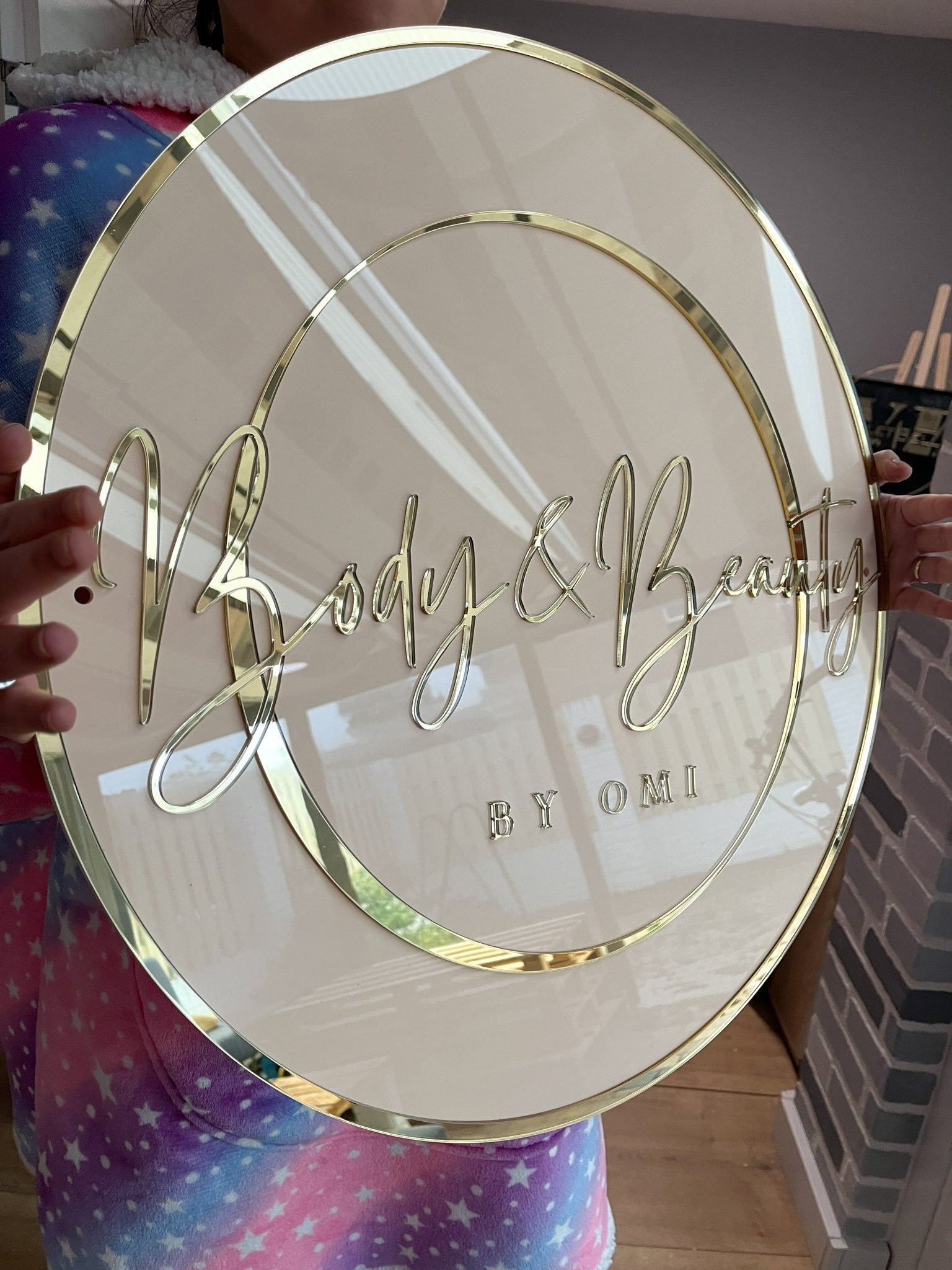 Enhance your branding with our elegant Round Acrylic Logo Signs featuring a modern golden design finish. Perfect for studios, boutiques, offices, or event décor, these signs are crafted to leave a classy and lasting impression.