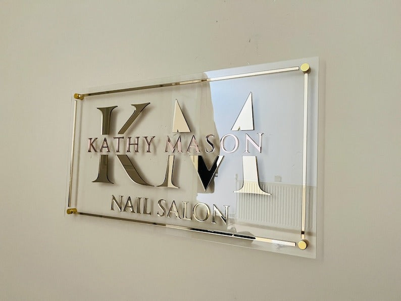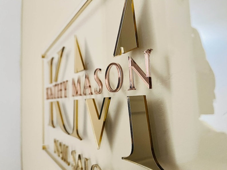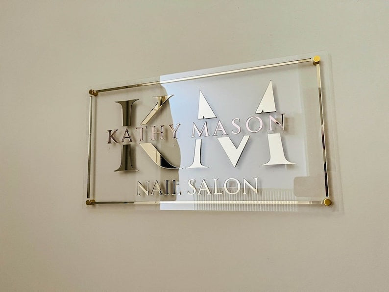 “Luxury 3D Acrylic Business Sign – Custom Layered Wall Sign with Gold Standoffs – Personalized Logo Sign for Salon, Spa, Boutique, or Office”
