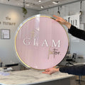 Give your brand a premium makeover with our Round Acrylic Logo Signs featuring a soft pink matte background and stunning rose gold mirror letters. Perfect for salons, skin clinics, studios, boutiques, and reception décor, this elegant signage ensures your space stands out.