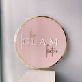 🌟 Round Acrylic Logo Sign – Rose Gold & White Letters with Pink Base