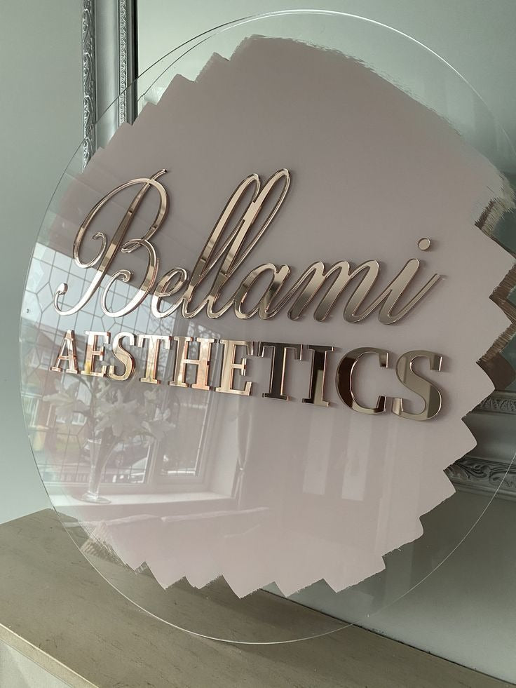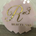 Give your brand a premium makeover with our Round Acrylic Logo Signs featuring a soft pink matte background and stunning rose gold mirror letters. Perfect for salons, skin clinics, studios, boutiques, and reception décor, this elegant signage ensures your space stands out.