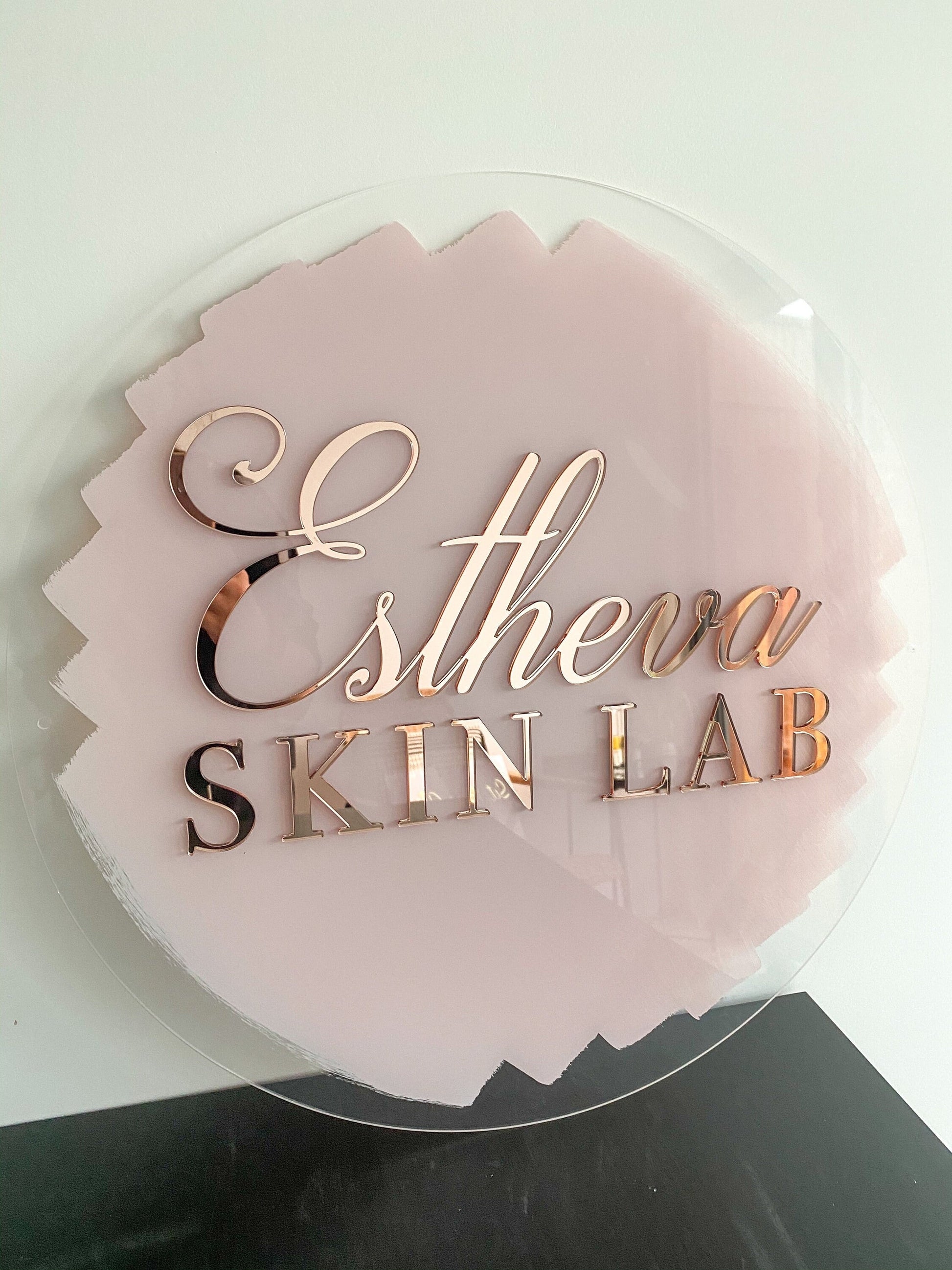 🌟 Round Acrylic Logo Sign – Rose Gold Letters with Pink Base