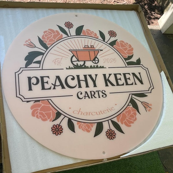 “Custom Round Acrylic Business Sign – Personalized Logo Sign with Floral Design – Modern Shop, Café, Bakery, or Cart Signage”