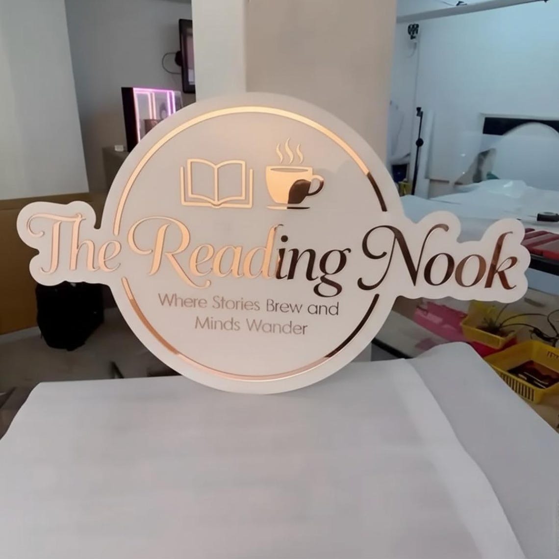 🌟 Round Acrylic Logo Sign – Pink Base with Rose Gold Lettering