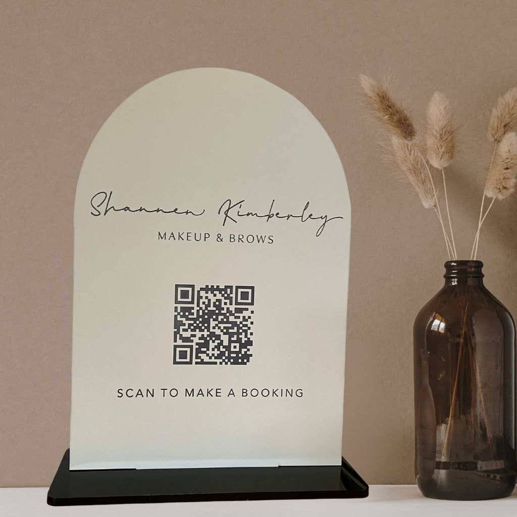 Make it simple for your clients to book appointments with this modern acrylic QR code sign. Designed with a sleek arch shape, it features your business name, services, and a scannable QR code that directly links to your booking page. A stylish and professional way to elevate your space while making customer engagement effortless.