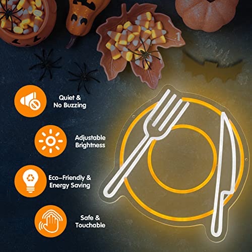 - Multi-functional Decoration: Akelever Tableware Neon Sign is an ideal choice for kitchen decor, featuring a unique design of utensils that brings a vibrant visual effect to your wall. It measures 12.5 x 12.5 inches (Golden Warm White).