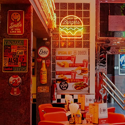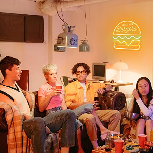 - ???Unique Design?This hamburger neon sign is made of 5mm acrylic bottom and silicone led neon tube. Compared to other similar products, it's a unique burger advertising design in a larger size, simple but not usual with βEnjoy Our Burgersβ. It'll be an eye-catcher at your store, room, home or party!