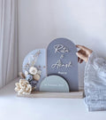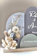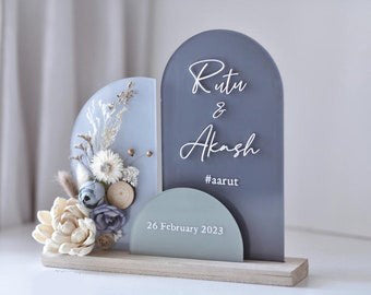 Make your special day unforgettable with this elegant personalized acrylic name plate, designed in a modern multi-arch style with delicate dried flowers. Perfect for weddings, engagements, anniversaries, and home décor, this piece adds a timeless charm to your memories.