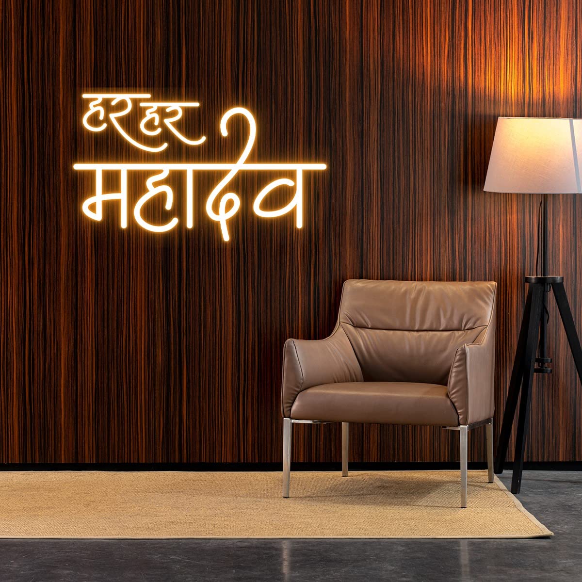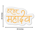 - The phrase 'Har Har Mahadev' is elegantly showcased in vibrant LED neon lights. Meticulously handcrafted using flexible neon tubes mounted on a durable acrylic backing. Creates a soft and warm glow that replicates the classic neon signage effect. Energy-efficient LED technology ensures long-lasting performance and minimal power consumption.